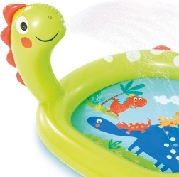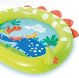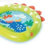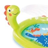 Piscină gonflabilă veselă cu fântână și motiv de dinozaur, ideală pentru distracție de vară în grădină. Piscina este realizată din material PVC de calitate cu dimensiuni de 119 x 109 x 66 cm.
