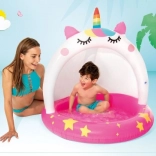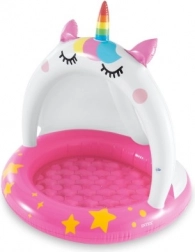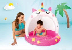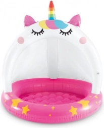 Piscina drăgălașă pentru copii INTEX, în formă de unicorn, cu baldachin, oferă multă distracție în siguranță pentru copiii de 1–3 ani. Acoperișul de umbrire protejează de soare, podeaua moale, gonflabilă sporește confortul, iar vinilul rezistent de 0,25 mm asigură o durată lungă de viață. Dimensiunile compacte 102×102 cm și volumul 45 l sunt ideale pentru primele jocuri cu apă în grădină.