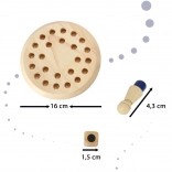 - Conținutul pachetului: tablă circulară cu orificii, 24 de pioni din lemn în 6 culori, zar din lemn cu culori
