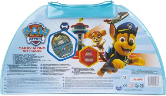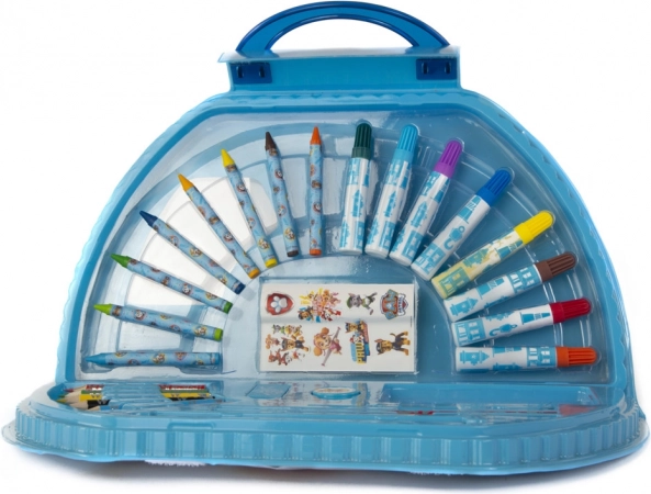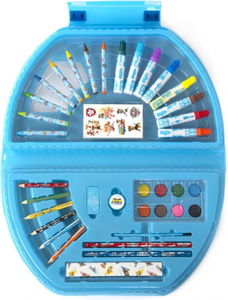 Geantă de desen metalică Patrula Cățelușilor – conține markere, creioane cerate, creioane colorate, acuarele, creioane grafit, riglă, gumă, ascuțitoare, pensulă și autocolante.