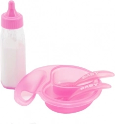 Acest set pentru păpuși este accesoriul ideal pentru orice mică îngrijitoare. Prepară mâncăruri delicioase în bol și servește-le păpușii tale folosind lingurița și furculița incluse. Observă cum laptele din sticlă 'dispare' când îi dai păpușii să bea, și reapare când întorci sticla. Acest set aduce ore de distracție și încurajează dezvoltarea motricității fine și îngrijirea celor din jur.