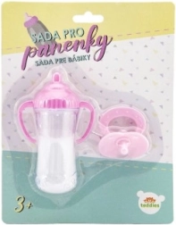 Set pentru păpuși conține biberon și suzetă, fiind ideal pentru a învăța păpușa dumneavoastră. Cadoul perfect pentru orice copil!