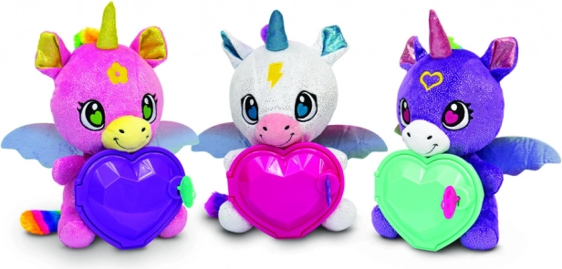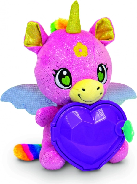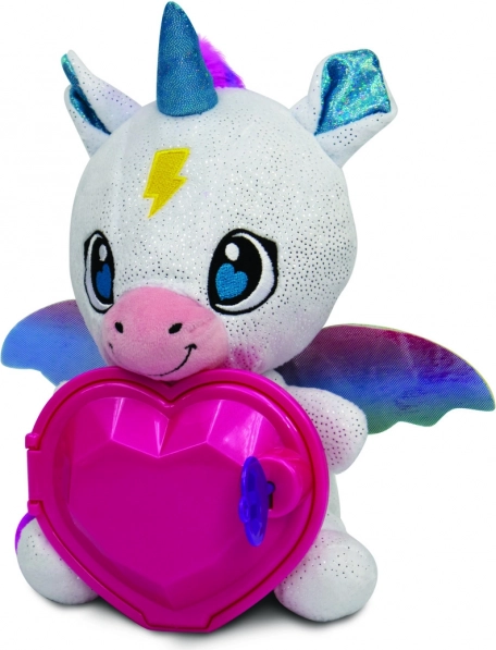 Ce vei găsi în interior: brățară cu surpriză, inel cu surpriză și autocolante. Copiii își pot păstra micile comori în inimioara unicornului și pot crea propriile povești secrete. Jucăria de pluș este moale, sigură și potrivită pentru îmbrățișări zilnice și joacă creativă.