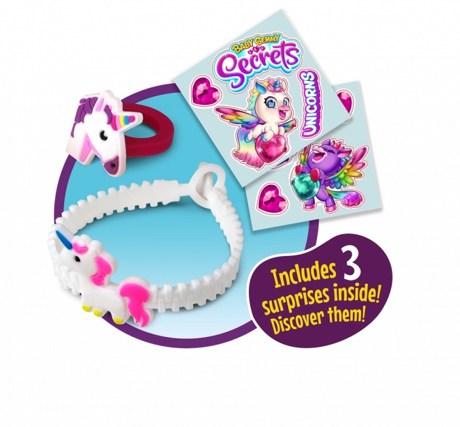 - 1× unicorn de pluș Baby Gemmy, 1× brățară cu surpriză, 1× inel cu surpriză, 1× autocolante