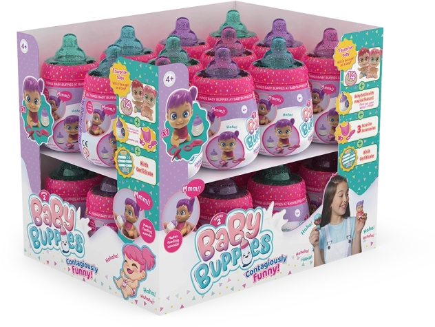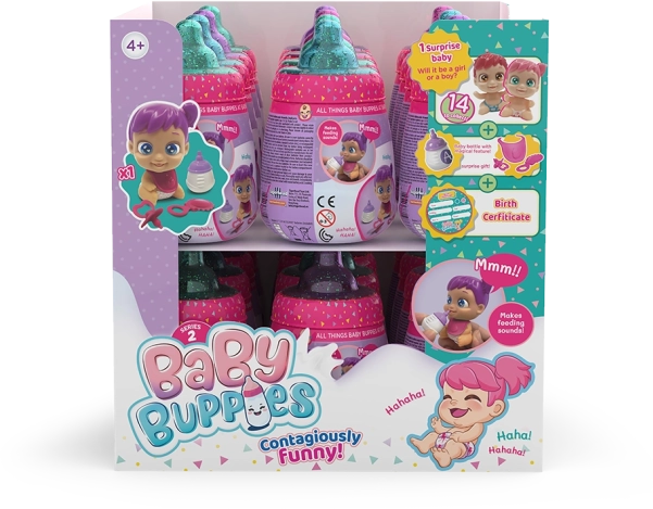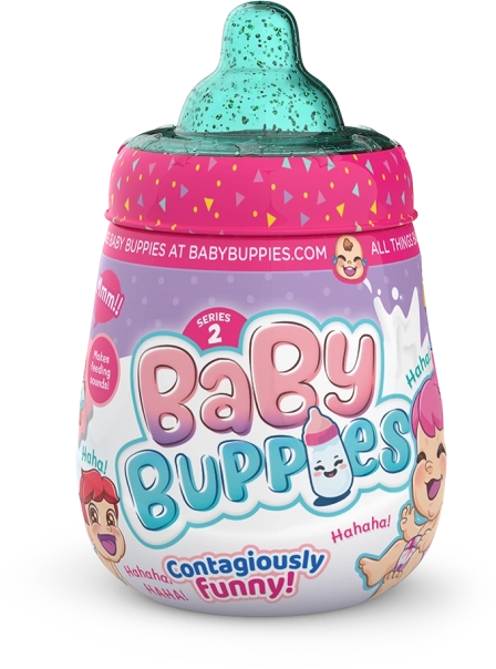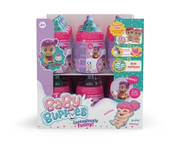 Baby Buppies sunt păpuși de colecție distractive, într-un ambalaj stilat care amintește de o sticluță. Fiecare bebeluș poate gânguri realist și râde, aducând în joc emoție și multă veselie. Datorită culorilor vii și designului adorabil, copiii le vor îndrăgi rapid.