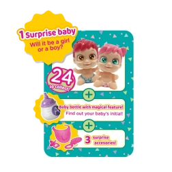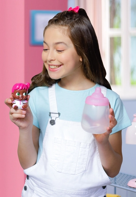 Ambalajul stilat în formă de sticluță pentru bebeluși adaugă bucurie momentului de despachetare și servește și ca ascunzătoare practică pentru păpușă.