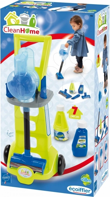 Acest cărucior de curățenie din gama Ecoiffier este echipat cu un aspirator vertical cu trei duze diferite, două soluții de curățare și un cărucior cu două roți, care facilitează deplasarea întregului set oriunde.