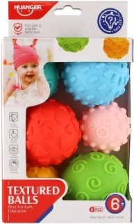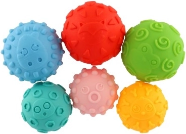 Fiecare mingiuță scârțâie atunci când este apăsată, motivând copiii la joacă, întărind priza și dezvoltând percepția auditivă.
