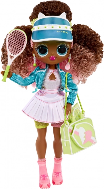 Păpușa îmbrăcată într-o ținută viu colorată de tenis cu șapcă, rachetă și geantă sport combină perfect moda cu jocul.