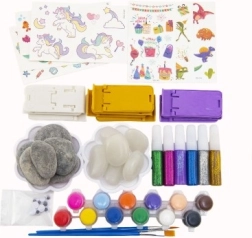 Acest set complet pentru pictură pe pietre oferă ore întregi de activități creative. În pachet găsești 12 pietre, dintre care 6 strălucesc în întuneric, și numeroase accesorii pentru decorare și personalizare. Ideal ca dar, pentru activități acasă sau proiecte școlare.