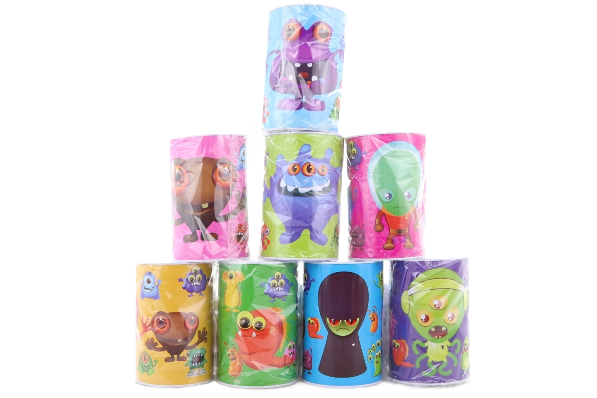 Pușculiță din tablă cu motiv cu monstruleti, dimensiune aproximativ 15 x 10 cm. Ambalată în săculeț. Pușculița nu are deschidere. Vârsta 3+
