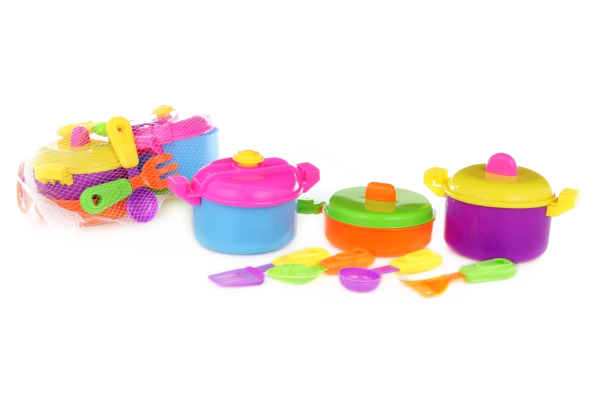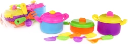 Acest set colorat de vase oferă copiilor tot ce au nevoie pentru a descoperi lumea gătitului. Datorită formelor și dimensiunilor realiste, susține jocul de rol, motricitatea fină și creativitatea. Totul este depozitat într-o plasă ușoară, care facilitează transportul și depozitarea.