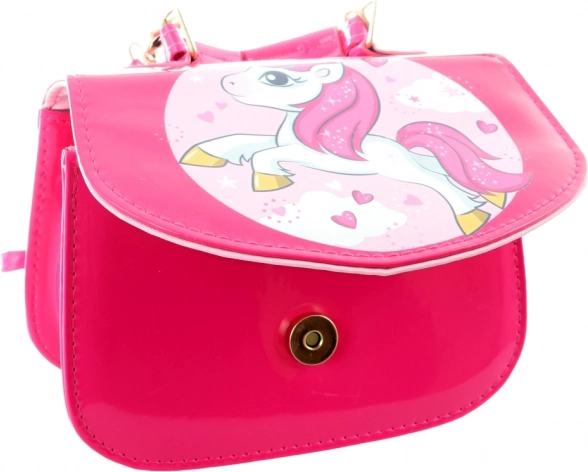 Această geantă roz cu unicorn drăgălaș este accesoriul perfect atât pentru purtare zilnică, cât și pentru ocazii speciale. Finisajul lucios, detaliile metalice aurii și imprimeul jucăuș o transformă într-o piesă stilată, iubită de copii.
