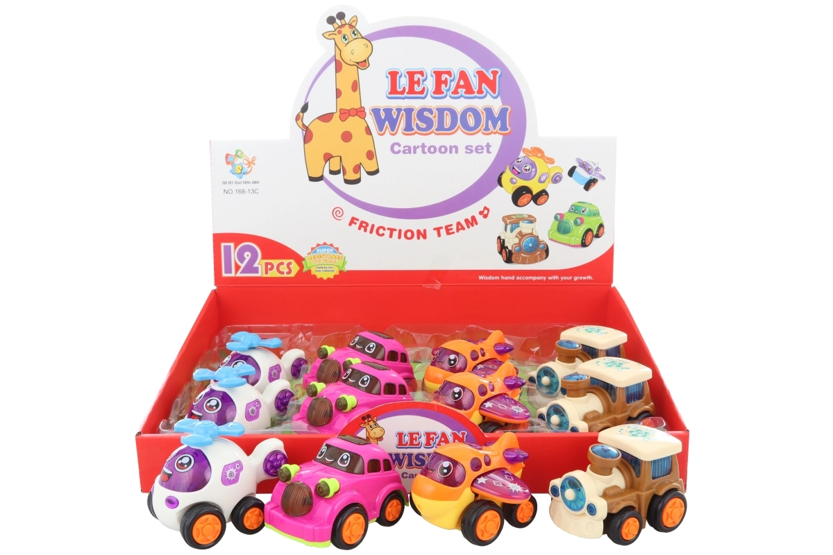 Set distractiv pentru micii șoferi și piloți: 12 vehicule din plastic cu mecanism inerțial. Include avioane, mașini, elicoptere și locomotive, ideal pentru copii de la 3 ani. Fiecare model este compact, se potrivește perfect în mână și, datorită mecanismului inerțial, pornește după fiecare împingere.