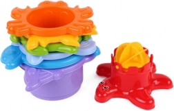 Acest set jucăuș combină stivuirea, turnarea și explorarea. Cănuțele în formă de animale marine au dimensiuni și perforații diferite, astfel încât apa curge în moduri variate – copiii se distrează experimentând și învață relațiile de cauzalitate. Piesele se introduc ușor una în alta, astfel jucăria nu ocupă spațiu și este ideală pentru călătorii.
