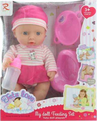 - Accesorii bogate: biberon, farfuriuță, linguriță și oliță