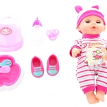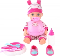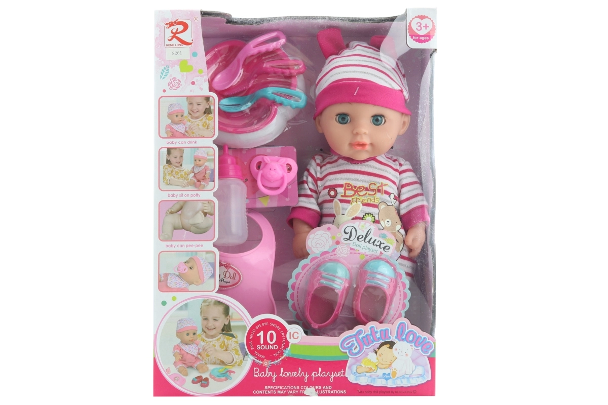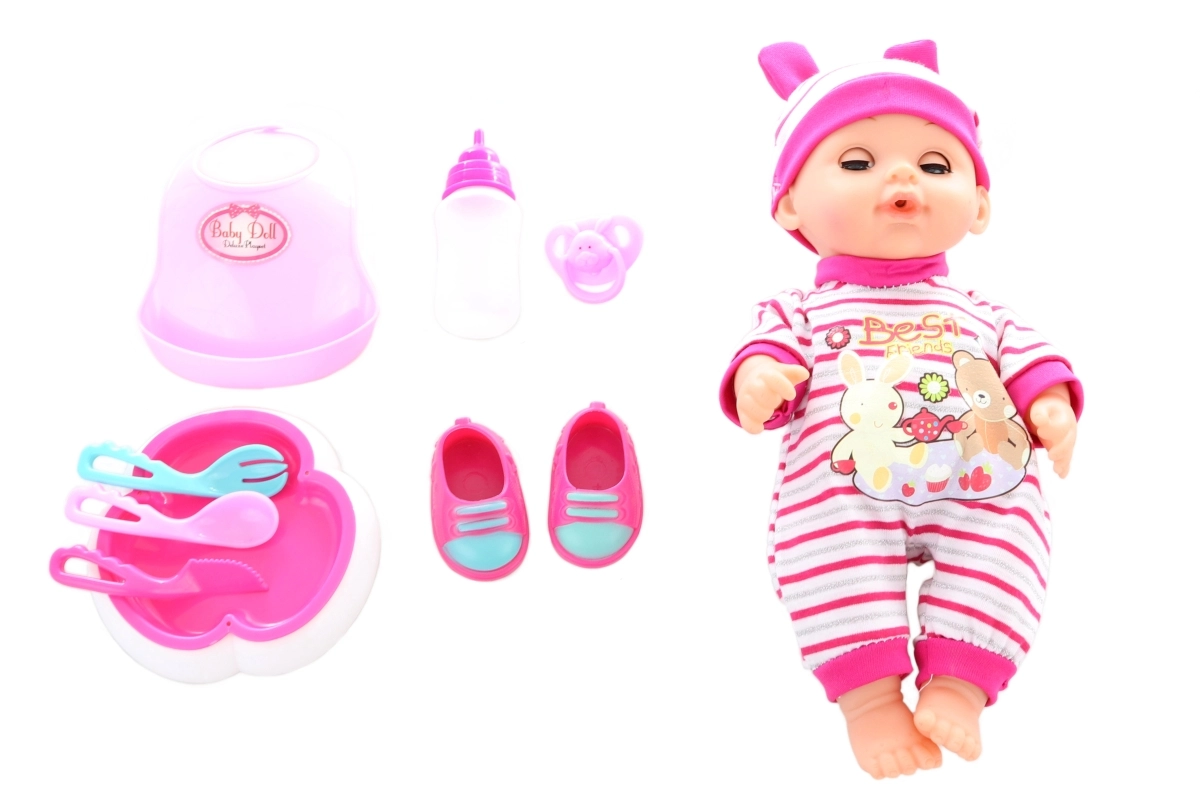 Setul include botoșei, bavetă din plastic, biberon, farfuriuță, tacâmuri și alte accesorii pentru un joc de imaginație variat.