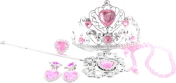 Acest set include o coroană decorată cu inimioare roz, cercei, un colier și un inel, pe care micul dumneavoastră nobil le va aprecia.