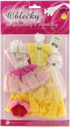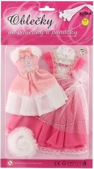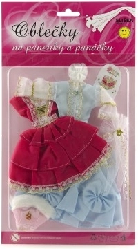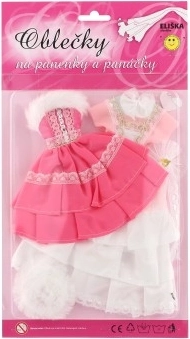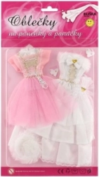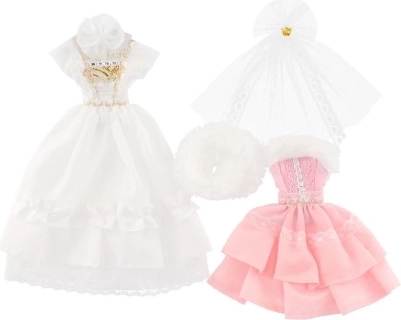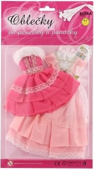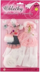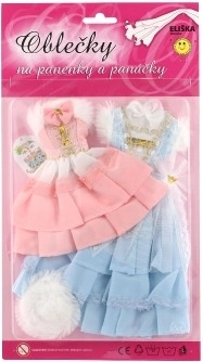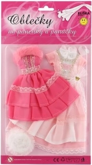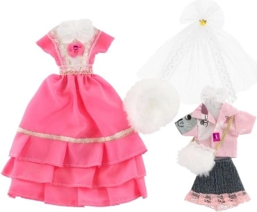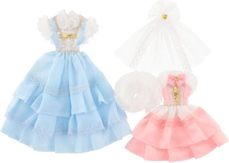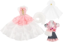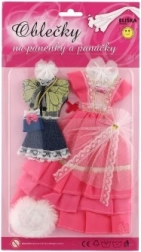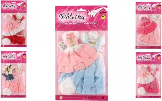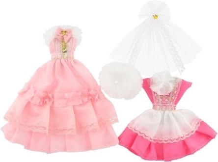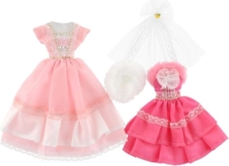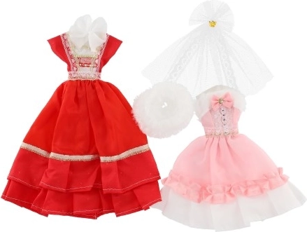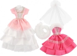 Două seturi diferite de rochii, fiecare având propriile detalii care adaugă fiecărei păpuși un aspect deosebit.