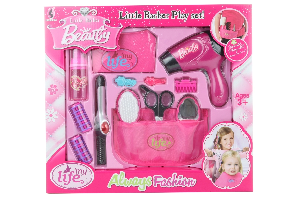 Include un uscător funcțional pe baterii (alimentare 1× AA, nu este inclusă), instrumente sigure pentru copii și un organizer practic pentru depozitarea ordonată a tuturor ustensilelor de coafură.