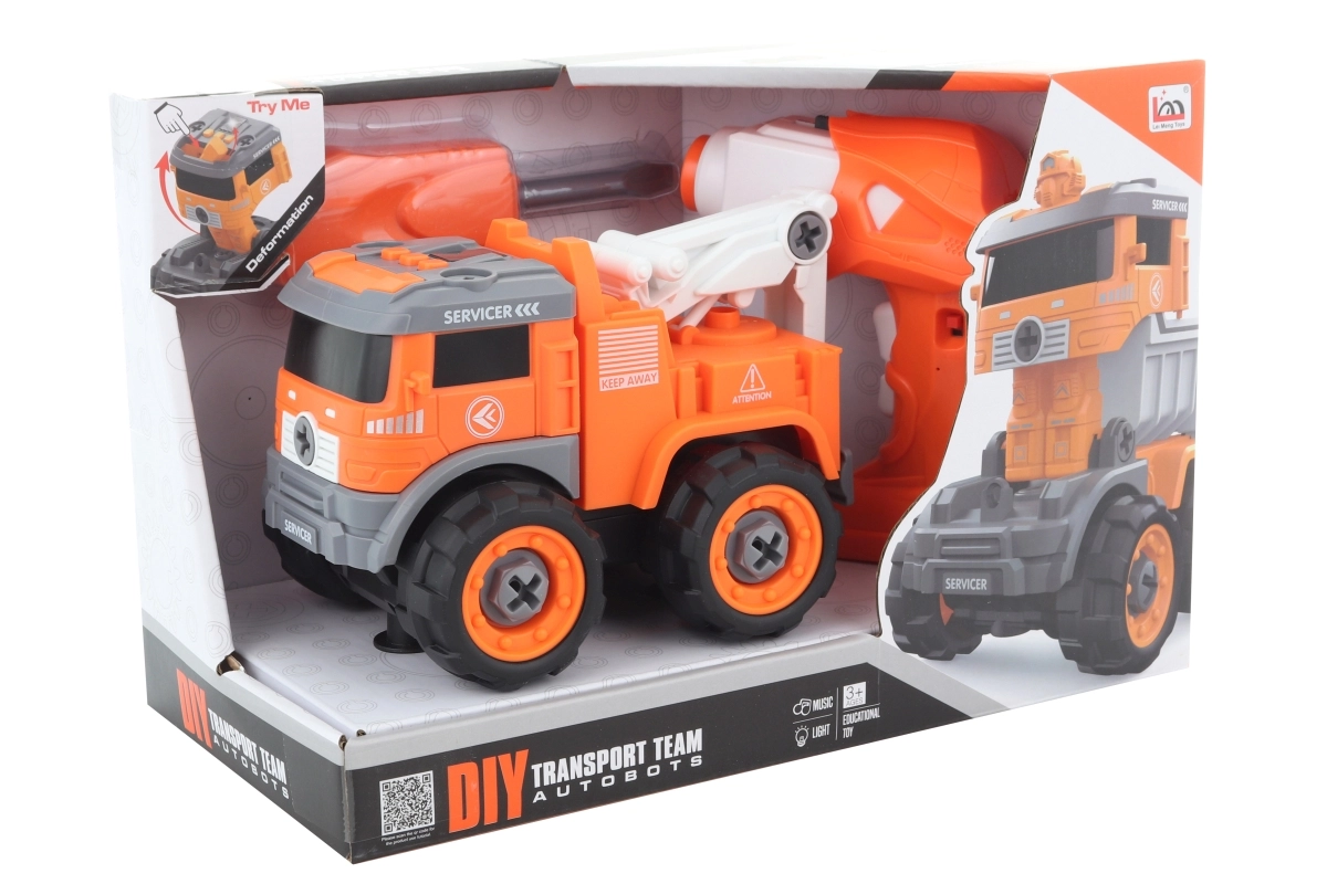 Această platformă de remorcare interactivă cu șuruburi este o alegere grozavă pentru micii meșteri. Copiii își asamblează singuri mașina folosind șurubelnița sau bormașina, din care se poate scoate motorul și introduce în mașină. Apoi pot controla deplasarea înainte și înapoi cu ajutorul telecomenzii. Mașina poate fi de asemenea transformată cu ușurință în robot, ceea ce prelungește distracția și dezvoltă imaginația.