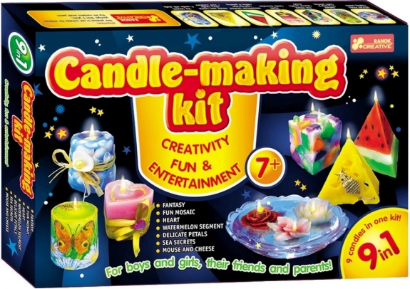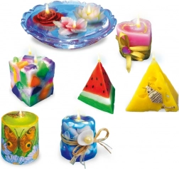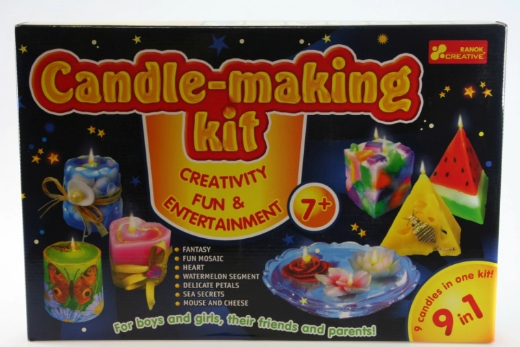 Cu acest set mare puteți realiza până la 9 lumânări în confortul casei. Diferite culori și forme de lumânări (inimă, pepene, marină, plutitoare, brânză și șoarece, mozaic etc.). Pachetul conține tot ce este necesar pentru fabricare (parafină, forme de turnare, colorant, fitiluri, vopsele acrilice, lipici, sclipici, mărgele de sticlă, panglici de satin etc.). Setul include, de exemplu, bază de ceară, șabloane, pahare, formețe, sârmă, mărgele, scoici, șervețel decorativ, vopsele, panglică, lipici, sfoară, creioane cerate și multe altele. Dimensiunea pachetului: 30 x 44 x 6 cm. Vârsta 7+. FABRICAT ÎN EUROPA