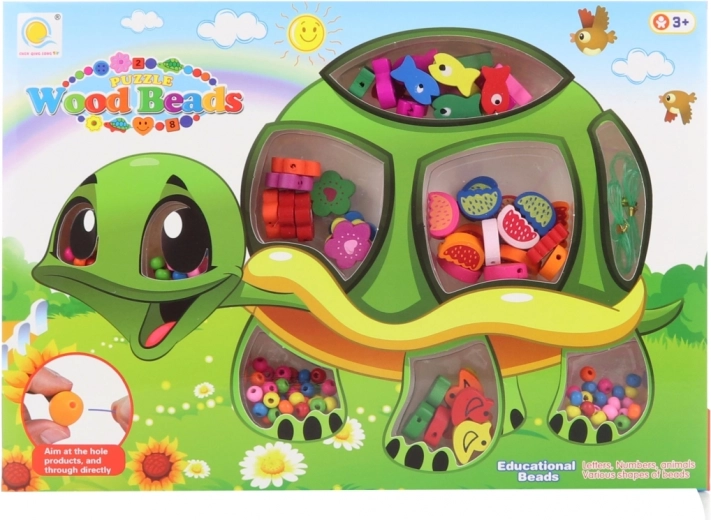Set creativ cu mărgele din lemn cu motiv de broască țestoasă, pentru copii de la 3 ani, care dezvoltă motricitatea fină și imaginația. Conține multe forme colorate și șnururi pentru înșirat, într-un ambalaj practic de aprox. 28 × 19,5 × 2,5 cm.