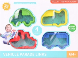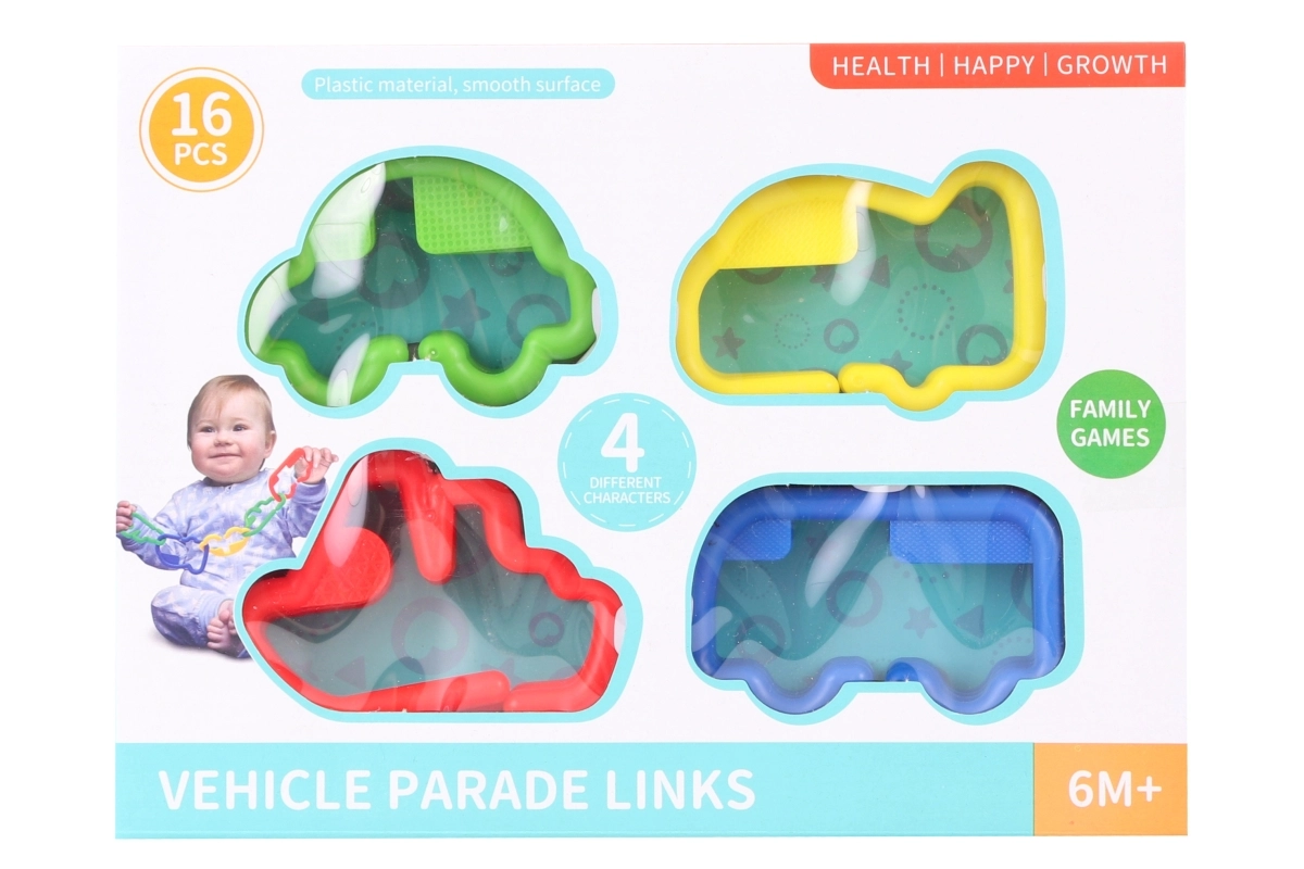 Lanț colorat de conectare din plastic, cu piese în formă de mijloace de transport, pentru agățat pe cărucior sau scaun auto. Susține motricitatea fină, percepția vizuală și dezvoltarea senzorială. Pachetul conține 16 piese. Potrivit de la 6 luni.