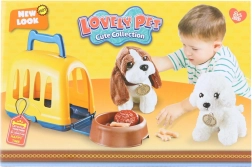 Pachetul include un cățeluș de pluș cu dimensiuni aprox. 18 × 12 cm, o cușcă de transport din plastic (20 × 21 × 13 cm), un bol și hrană. Totul este adaptat mâinilor mici ale copiilor și se transportă ușor.