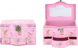 Cutie de bijuterii cu sertare. În interiorul capacului se află o oglindă, iar în partea de jos a cutiei se găsesc 3 sertărașe practice. Dimensiunile cutiei de bijuterii aprox. 17 x 11,5 x 10 cm. Ambalată în săculeț. Vârsta 3+