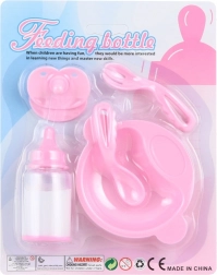 Set de accesorii pentru păpuși ideal pentru jocurile de rol, conține biberon, suzetă, farfurie și tacâmuri. Accesoriu perfect pentru orice mică grijulie.