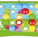 Descoperiți un joc creativ care dezvoltă imaginația și abilitățile. Copiii introduc piroane colorate în șabloane cu motive din natură (de ex. omidă, flori sau animăluțe) și exersează precizia, răbdarea și recunoașterea culorilor. Găurile și piroanele mari se prind bine și facilitează manipularea pentru mâinile mici.