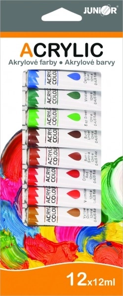 Set universal de vopsele acrilice pentru creație pe diverse suprafețe. Conține 12 nuanțe vii a câte 12 ml, care pot fi diluate cu apă și utilizate pe hârtie, carton și pânză. Potrivite și pentru decorarea ceramicii, sticlei și pietrelor. Ideal pentru începători și copii de la 3 ani.