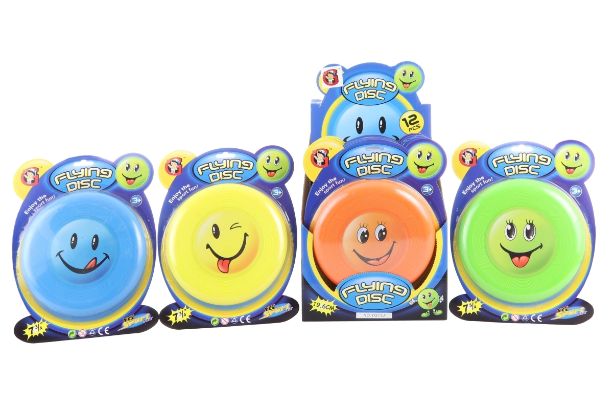 Bucurați-vă de multă voie bună cu discul zburător colorat, având un motiv vesel cu față zâmbitoare. Datorită diametrului compact, de aproximativ 19 cm, se ține bine chiar și de către copiii mai mici și este ușor de aruncat și de prins. Este perfect pentru momentele petrecute în familie la aer curat și încurajează mișcarea sănătoasă.