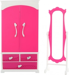 Dulapul GLORIE cu oglindă este un accesoriu grozav în lumea păpușilor. Oferă uși și sertare care se deschid pentru depozitarea rochițelor și accesoriilor și umerășe practice pentru a agăța ținutele preferate. Datorită oglinzii incluse, copiii pot combina ușor și încerca noi creații stilate.