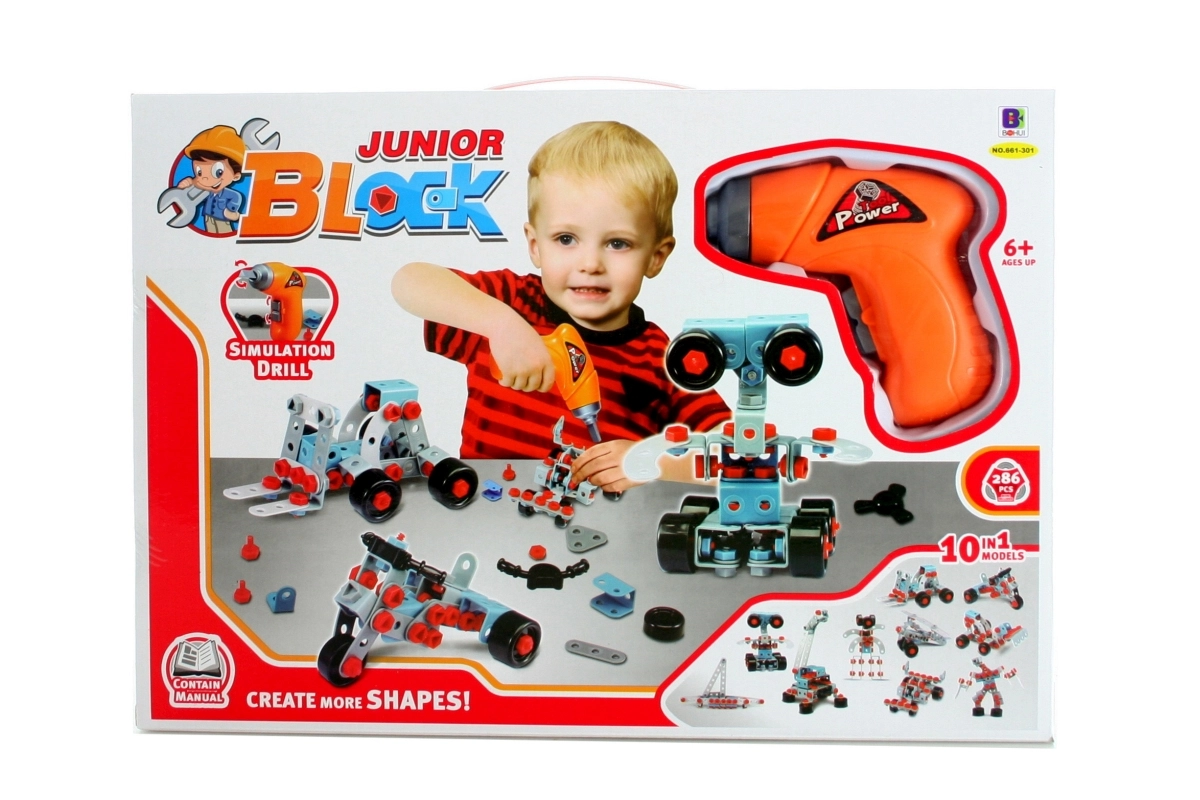 Dezvoltați creativitatea și motricitatea fină cu setul de construcție universal Junior Block. Pachetul include 286 de piese, inclusiv o bormașină cu acumulator simulată, și le permite copiilor de la 6 ani să construiască până la 10 modele diferite de vehicule, roboți și alte structuri. Ambalaj practic (aprox. 41 × 29 × 6 cm) și înșurubare ușoară cu șuruburi și piulițe din plastic pentru ore întregi de distracție. Bormașina funcționează cu 2× baterii AA (nu sunt incluse).