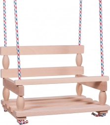 Acest leagăn din lemn natural aduce în grădina ta, pe terasă sau în camera copilului bucuria legănării într-un stil clasic, atemporal. Construcția robustă din lemn, cu elemente rotunjite și bare de siguranță, oferă stabilitate chiar și pentru copiii mai mici, în timp ce șezutul spațios de 40 × 30 cm asigură confort la fiecare mișcare.