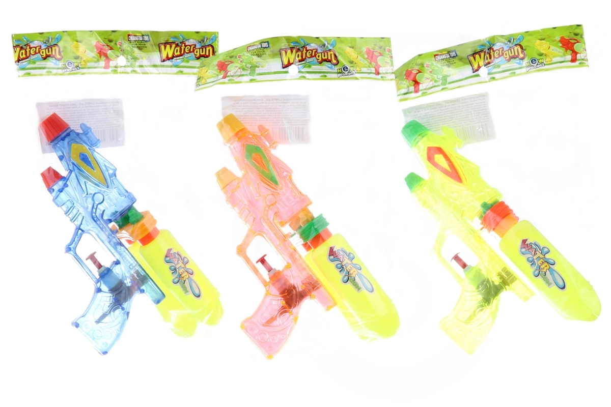 Pistol din plastic pentru apă, cu o lungime de aproximativ 21 cm, prevăzut cu două rezervoare de apă. Vârsta 3+