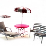 - Șezlong din plastic, 2 scăunele de grădină din plastic, măsuță de grădină din plastic, umbrelă de soare