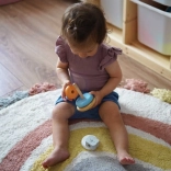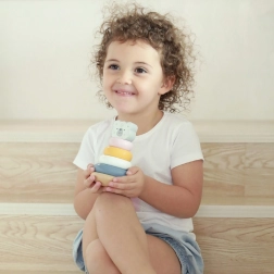 Setul include șase inele colorate pastel, inclusiv inelul principal cu cap de urs, care dezvoltă abilități vizuale și motorii.