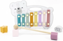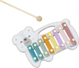 Xilofonul din lemn în forma unui urs polar îmbină estetica jucăușă cu un instrument muzical funcțional. Lamele metalice în culori pastel creează tonuri plăcute la lovirea cu bagheta din lemn, motivând copiii în mod natural să experimenteze cu sunete și ritm.