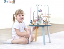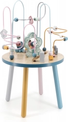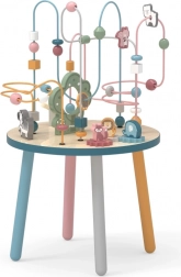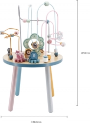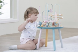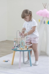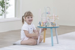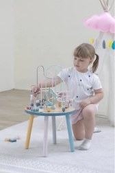 Labirintul cu mărgele, așezat pe o măsuță solidă din lemn, îi îndeamnă pe copii să exploreze. Formele colorate și animăluțele drăguțe (ursuleț, vulpe, arici) îi motivează să își miște degețelele, să exerseze prinderea precisă și să creeze propriile povești. O alegere ideală pentru stilul „Montessori” de învățare prin joc, care dezvoltă răbdarea, concentrarea și imaginația.