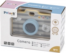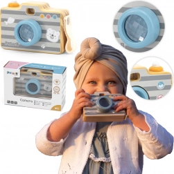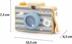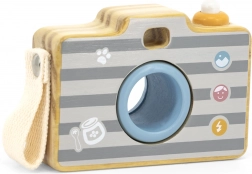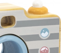 Jucăria este realizată din lemn de calitate și finisată cu vopsele netoxice, sigure pentru copii. Construcția robustă, marginile netede și mânerul lateral asigură o utilizare confortabilă și sigură. Aparatul foto dezvoltă excelent motricitatea fină, coordonarea și creativitatea în timpul jocului de rol.