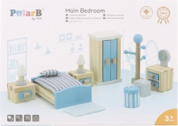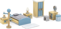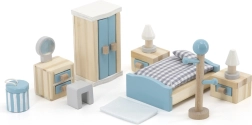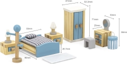 Patul, 2 noptiere, dulapul, cuierul și măsuța de toaletă cu taburet completează orice locuință miniaturală. Copiii pot aranja cu ușurință mobilierul și își pot crea propriile povești.