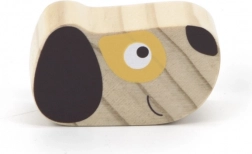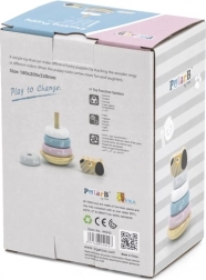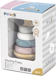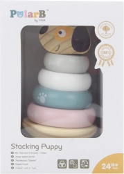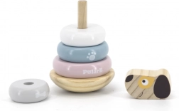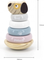 Această piramidă de stivuire cu motiv de cățel aduce copiilor bucuria descoperirii și a învățării. Piesele din lemn, netede, în culori pastelate delicate, se țin ușor chiar și cu mânuțe mici, iar așezarea inelelor pe tijă susține concentrarea, răbdarea și reprezentarea spațială. Baza stabilă asigură joaca în siguranță, iar căpșorul simpatic de cățel motivează la stivuiri repetate.