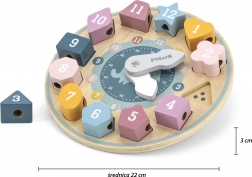 Cifrele clar lizibile, marcajele cu puncte pentru numărare vizuală și culorile pastel susțin dezvoltarea abilităților preșcolare. Lemnul de fag și vopselele netoxice asigură siguranță și durabilitate îndelungată. Jucăria îi motivează pe cei mici să descopere independent și oferă multe modalități de joc – de la ordonarea cifrelor 1–12, potrivirea formelor până la primii pași în stabilirea orei.
