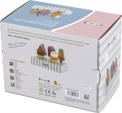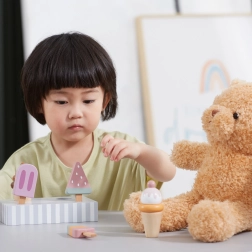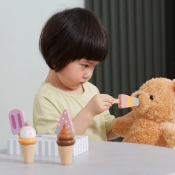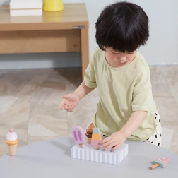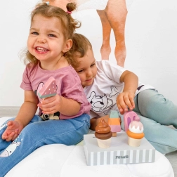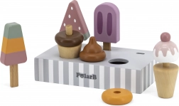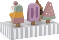 Setul de 5 înghețate din lemn în culori atrăgătoare aduce copiilor porții nesfârșite de distracție. Înghețatele sunt așezate pe un suport stabil din lemn, care servește pentru expunere și depozitare organizată. Totul este realizat din lemn de calitate și vopsit cu culori sigure, netoxice.