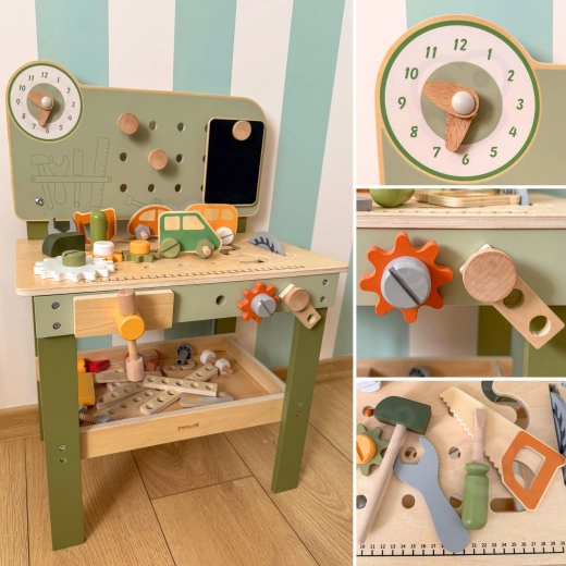 Setul include unelte (ciocănel, cheie, șurubelniță), șuruburi, piulițe, roți dințate, panou cu ceas educativ și o poliță practică pentru depozitare. Copiii pot asambla propriile creații, „repara” și sorta piesele – ideal pentru dezvoltarea creativității, răbdării și planificării.