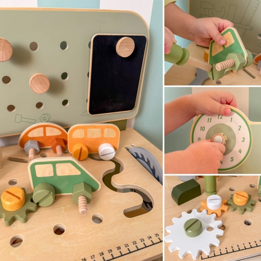 Banca cu pegboard, riglă gradată și elemente rotative susține jocul realist și dezvoltarea abilităților de lucru cu uneltele.