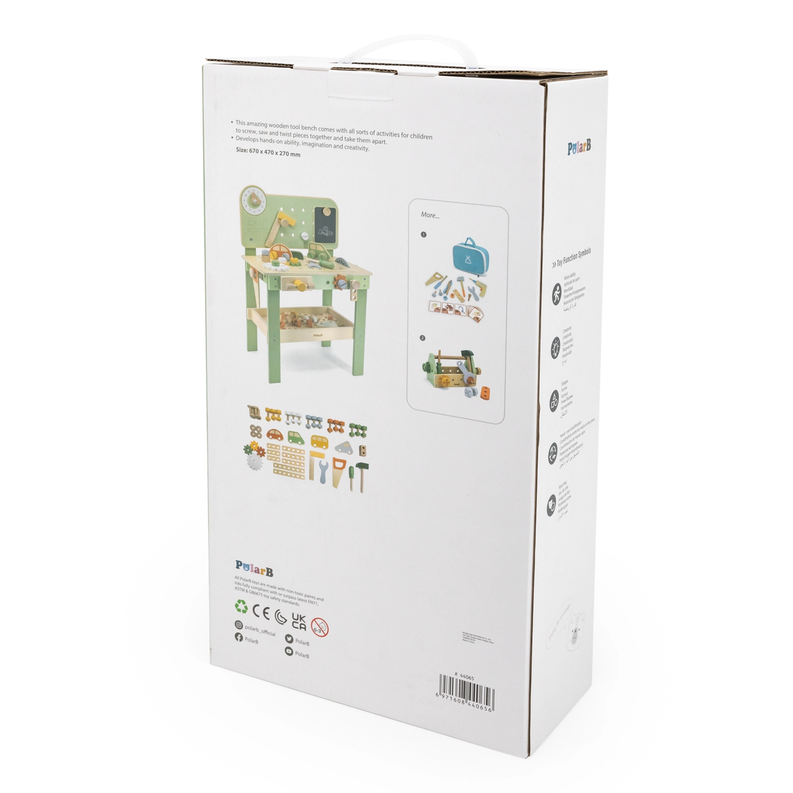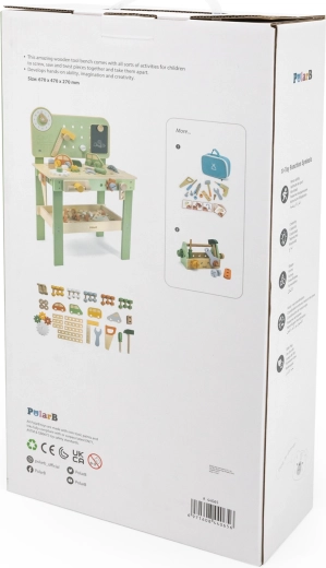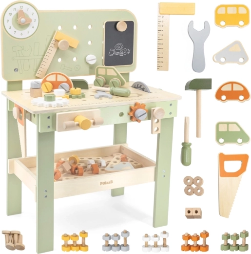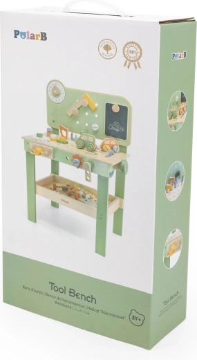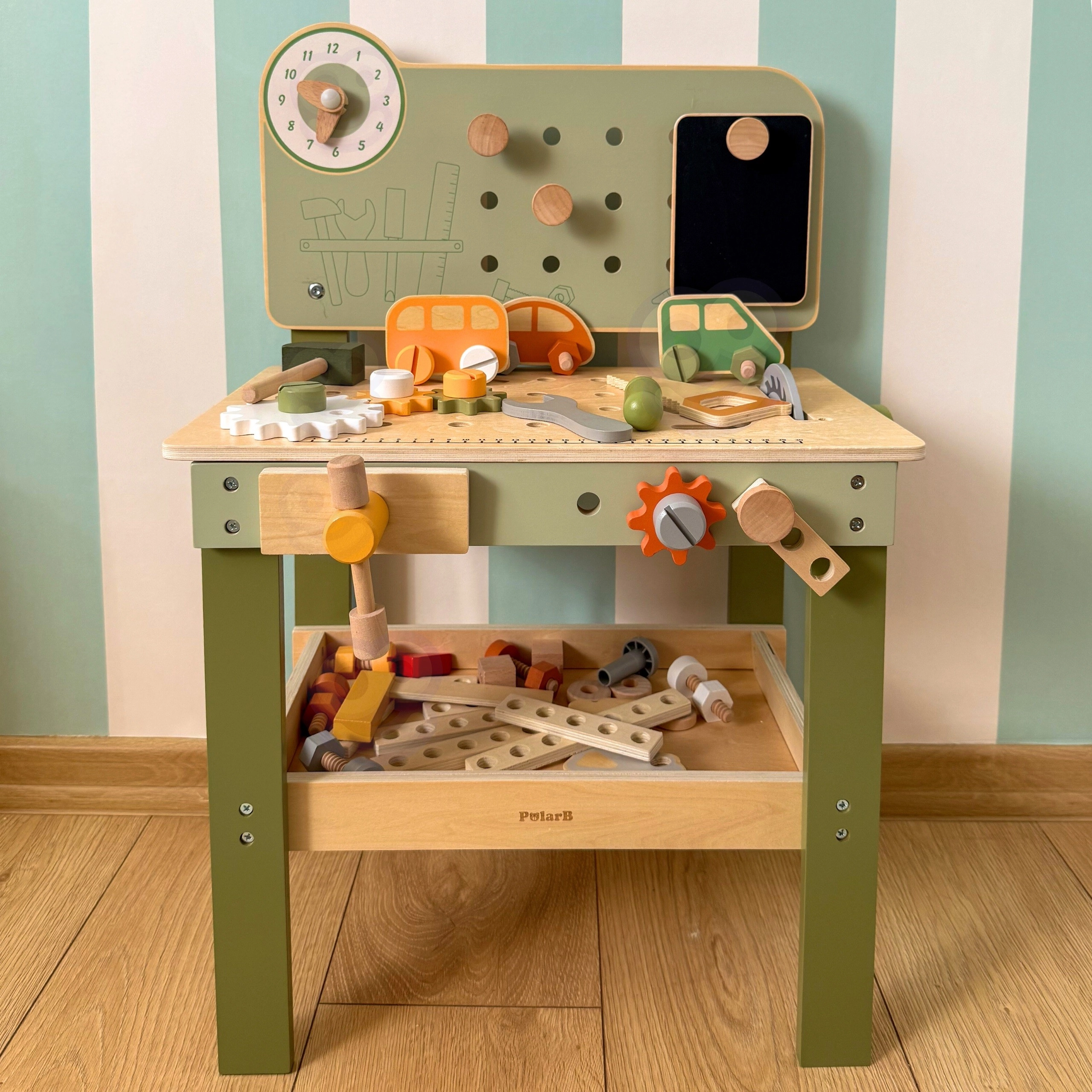 Descoperiți banca robustă și stilată Viga PolarB, concepută pentru micii meșteri de la 3 ani. Datorită construcției din lemn, roților dințate care se învârt lin și accesoriilor bogate, copiii își antrenează coordonarea mână–ochi și învață să rezolve sarcini prin joacă. Materialele sigure și detaliile bine gândite garantează durabilitate îndelungată și depozitarea comodă a componentelor.